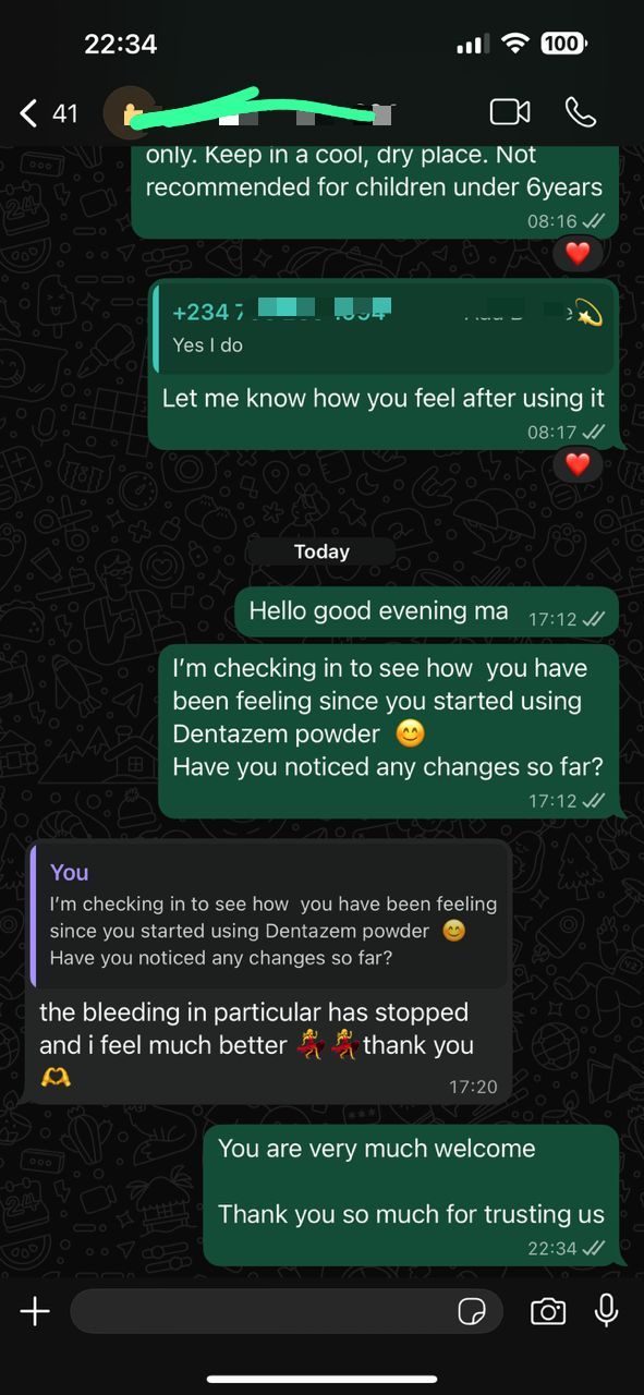 I was battling tooth pain, bleeding gums, and stubborn stains for almost 2 years. It affected my confidence badly. But after using Dentazem consistently for 4 months, the pain disappeared, the stains cleared, and my breath became fresh again. Now my teeth feel strong and look white. Dentazem truly restored my smile.”